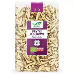 SKŁADNIKI ekologiczne suszone jabłka 100% OPIS Chrupiące frytki jabłkowe to wyśmienita przekąska. Polecamy zarówno dla dzieci, jak i dorosłych. Wartość odżywcza  w 100 g Wartość energetyczna  1516 kJ/359 kcal  Tłuszcz  0,5 g w tym kwasy tłuszczowe nasycone  0,1 g Węglowodany  79 g...