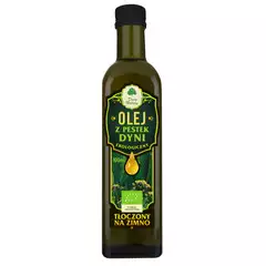 SKŁADNIKI olej z pestek dyni* 100 %. (*certyfikowany składnik ekologiczny) OPIS Nasz olej tłoczony jest na zimno z nasion dyni pochodzących z polskich ekologicznych gospodarstw rolnych. Ma przyjemny smak i zapach, dobrze komponuje się z ziemniakami, kaszami, sałatkami, surówkami, rybami....