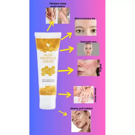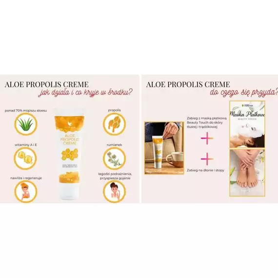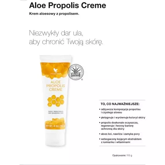 Aloe Propolis Creme łączy w sobie to, co najcenniejsze w naturze, by przywrócić Twojej skórze witalność i naturalny blask. Propolis świetnie sprawdza się w pielęgnacji każdego rodzaju skóry, również tej z problemami. Dezynfekuje i przyspiesza regenerację, POPRAWIA KOLORYT skóry, natłuszcza i TWORZY BARIERĘ OCHRONNĄ.