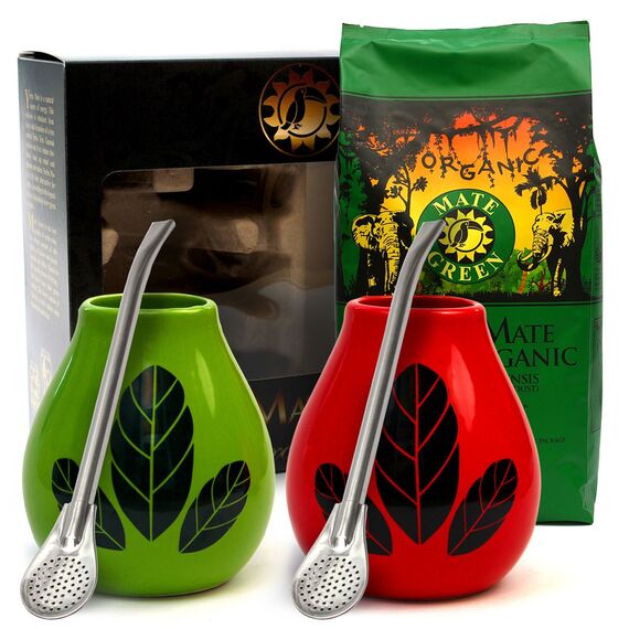 ZESTAW DLA DWOJGA YERBA MATE BIO 400 g, 2 x MATERO (LOSOWY WZÓR), 2 x BOMBILLA - ORGANIC MATE GREEN
