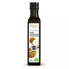 Orientacyjny termin przydatności:  31.12.2025 SKŁADNIKI ekologiczny olej z ORZECHÓW MAKADAMIA tłoczony na zimno 100 %. OPIS Olej z orzechów makadamia o lekko złocistej barwie oraz wyrazistym orzechowym smaku i aromacie. Znakomicie nadaje się do smażenia (wysoka temperatura dymienia...