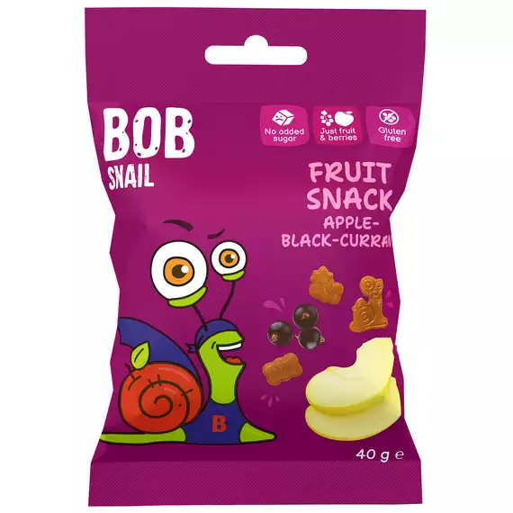 Żelki owocowe z dwóch składników - przekąski owocowe o smaku jabłkowo - porzeczkowym. Bez aromatów, bez dodanego cukru i bez glutenu. Żelki Ślimaka Boba porzeczkowe to zabawna przekąska w kształcie owoców i ślimaczków. Dzieciom zapewne spodobają się wesołe postacie.